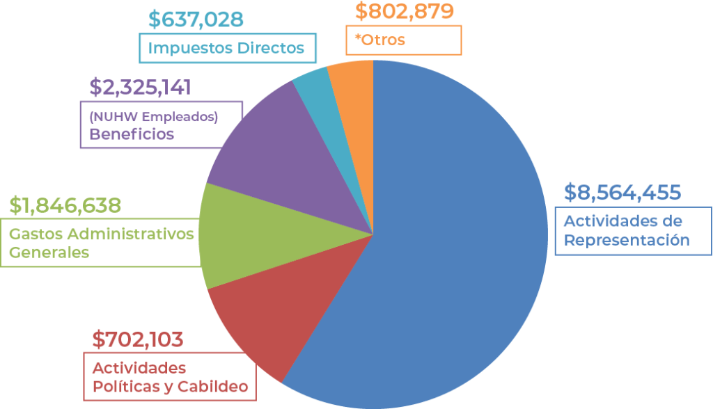 En el 2023, la Declaración LM-2 del NUHW informó que el sindicato recaudó más de $15.4 millones en ingresos de efectivo, que incluían $15.1 millones en cuotas y cargos de representación. Incluso con el ingreso de tanto dinero, el sindicato se las arregló para gastar el 90% del dinero recaudado.